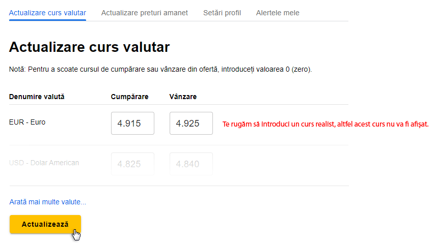 Pentru a-ti completa si actualiza cursul valutar apasa Actualizare curs valutar.